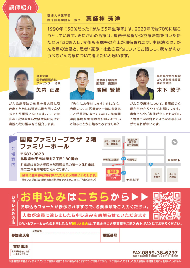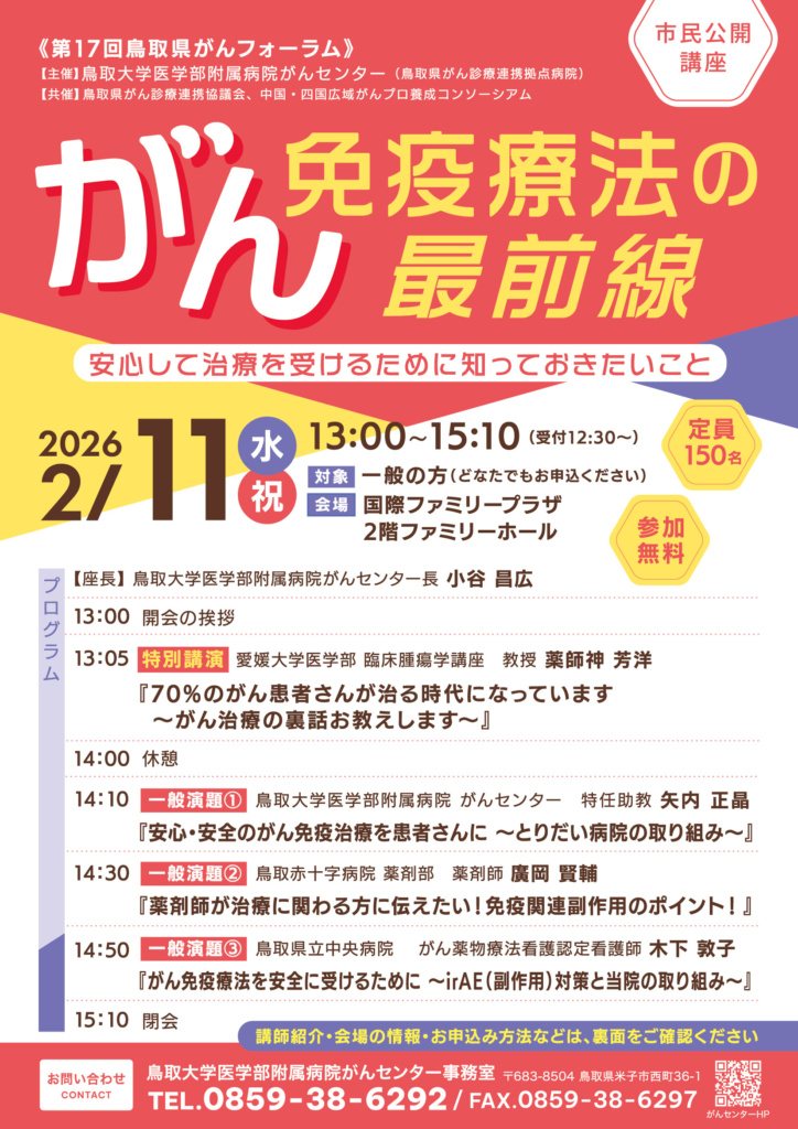 2/11開催予定の第17回鳥取県がんフォーラム「がん免疫療法の最前線~安心して治療を受けるために知っておきたいこと」の受付は終了いたしました。